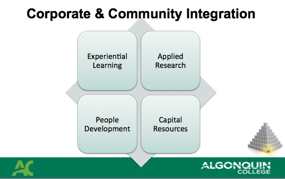 It is important to note that in all of these examples, the integration of a college in a community also includes not-for-profit and government organizations. That is, this is not simply a relationship between the private sector and colleges. This integration includes hundreds of companies and public organizations for Algonquin College. On each of these four key strategies, colleges accrue the many benefits of corporate and community integration.