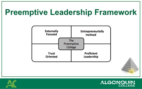 Let me end with the fourth cornerstone.  This cornerstone is based partly on my own research of leadership in high performing colleges and it is something that I use in evaluating who we are going to attract and promote at Algonquin. These are new times for us in higher education. To accomplish the three cornerstones shared this morning, we need a different kind of leader. I won’t go into each of these traits on this slide simply due to time, however as you can see on the slide, I contend educational leaders today must be externally focused – entrepreneurially inclined – trust oriented and practice proficient leadership; a skill that will positively create the change required to compete in today’s unique marketplace. This preemptive leadership must accept the paradox of higher education that what has made us successful today does not guarantee success tomorrow.