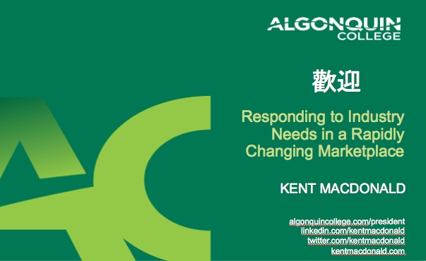 Good morning. My name is Kent MacDonald, President of Algonquin College, one of Canada’s largest and most progressive post secondary institutions. I am certainly pleased to share this stage today with my colleagues from England, France, Germany and the United States. During my time, I hope to share a Canadian perspective on this important and timely topic.