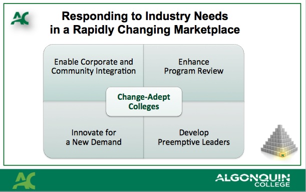 We need colleges that are change-adept more than ever. Change is very difficult and I agree with the old maxim that change always looks like failure in the middle. The ability to persevere, overcome the pundits shouting loudly from the sidelines – and there is always a group who are more comfortable being observers – will be better positioned for long-term success and sustainability. Algonquin’s innovation is led by our faculty and staff. Yet as these innovators bring ideas forward, there is always a minority who  are more comfortable simply criticizing.  Leadership to persevere is important and this is a third item I will address later.
